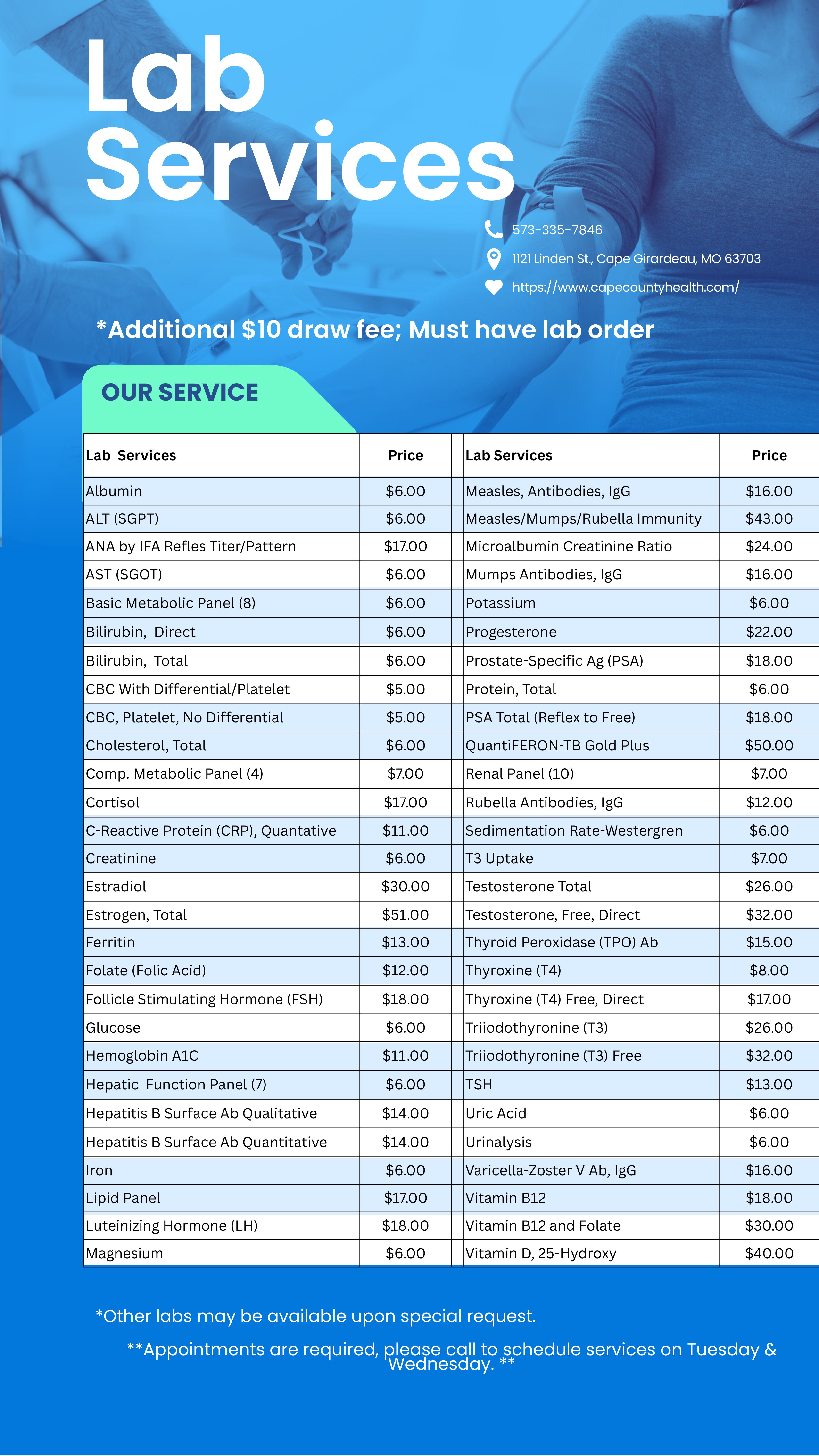 We're thrilled to provide low-cost Lab Services—by appointment—on Tuesdays and Wednesdays, 8:30 am to 4:30 pm. Rest assured that the quality of our lab tests are a priority. This service offers the best value for patients who are quality-conscious shoppers for their lab test needs. We're proud to make lab services more affordable so that healthcare is accessible to more people in Cape Girardeau.